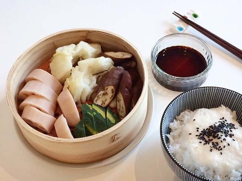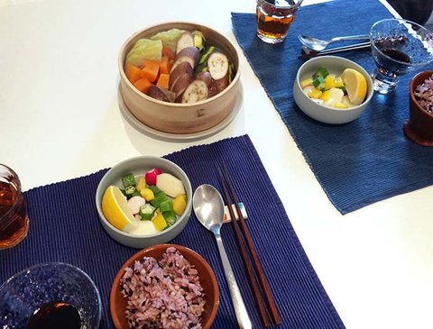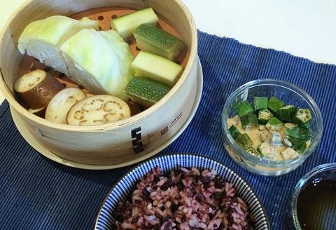 찐 연근 가지 애호박 양배추를 식초간장에 찍어 먹어요.