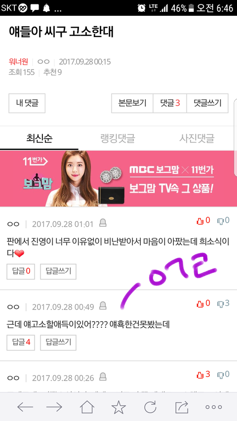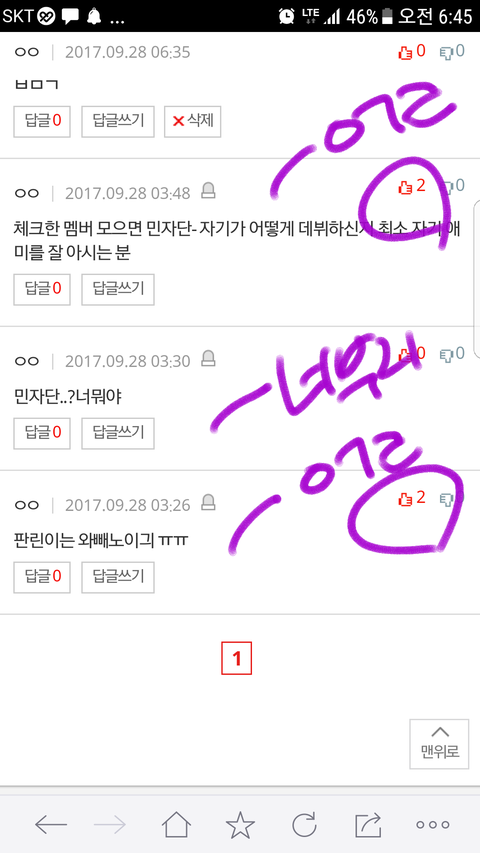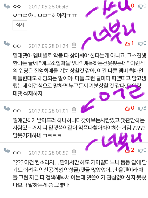 우리팬톡 너브리중에 민자단글 올리고 지녕이 고소글에 저런말할 너브리 없어~