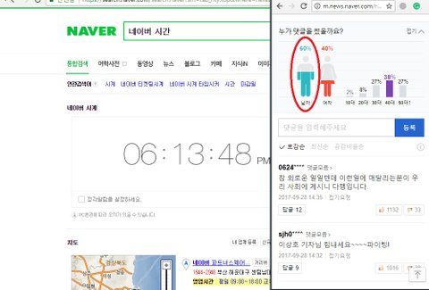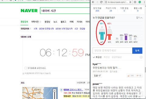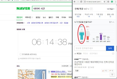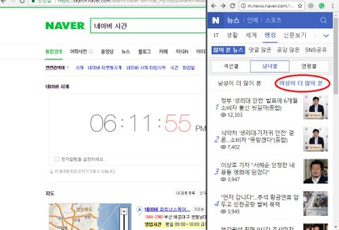 방금 네이버에서 찾아 본 기사만 이정도고 여성이 더 많이 본 기사 뿐만아니라 네이버 메인에 뜬 아무기사나 무작위로 들어가도 시간에 관계없이 30대 남성의 댓글 비율이 압도적이야