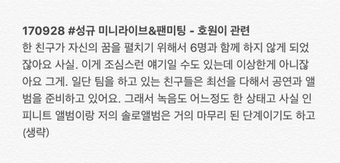 재계약하고 팬들 직접 처음 만나는 자리니 이런 정도의 언급은 해야한다고 생각한거 아닐까 근데 이걸로 성규 욕하는 사람들이 있네 그럼 아예 이런일조차 없었던거처럼 입에 담지도 말았어야하나 도대체 어느부분이 욕먹어야 하는 부분이지