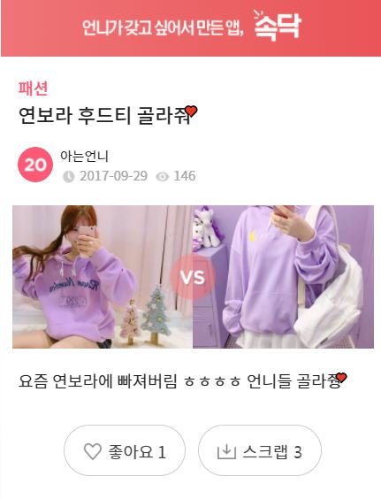 저 옷을 우연히 봤는데.. 연보라가 참 이쁘네요 ㅠㅠ근데 10대들만 입는 옷인가 싶어서요.. 나이는 20대 중반입니다입으면 많이 이상할까요???