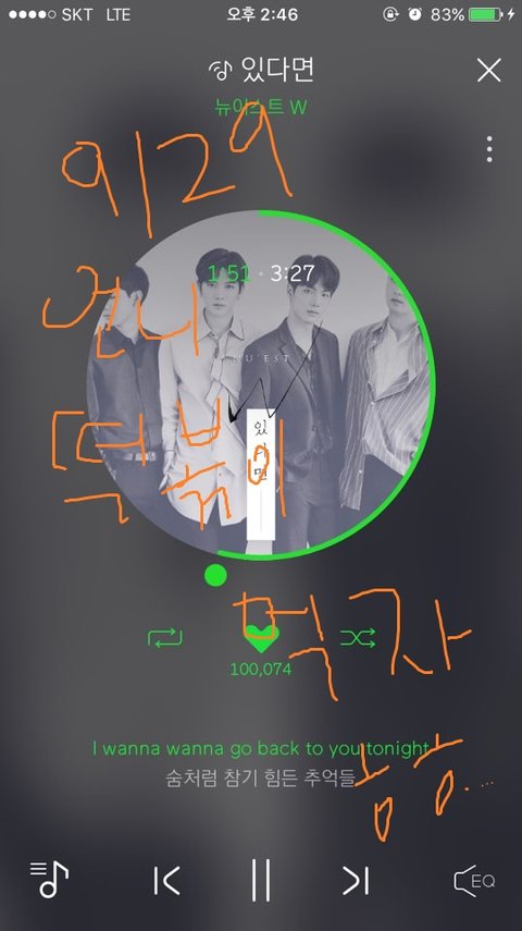 이거인데.. 보신 러브분들도 많으시겠지만 안보신 분들을 위해...!언니가 팬톡을 안해서 제가 대신 글쓰는건 양해좀 부탁드려용 ㅠㅠ이번 컴백 화이팅하세용!!! 제 본진은 내년 하반기 컴백이라스밍까지는 아니지만 제가 듣는 노래에 뉴이스트 노래 껴서 듣구이써요 ㅠㅠ..