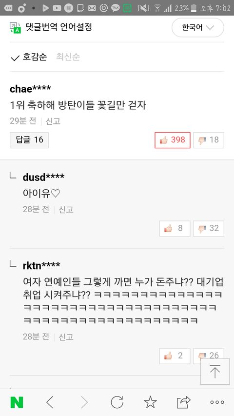 이삐들!!네이버메인에애들기사떴는데1위축하가아니고타가수랑비교댓글자꾸올라와