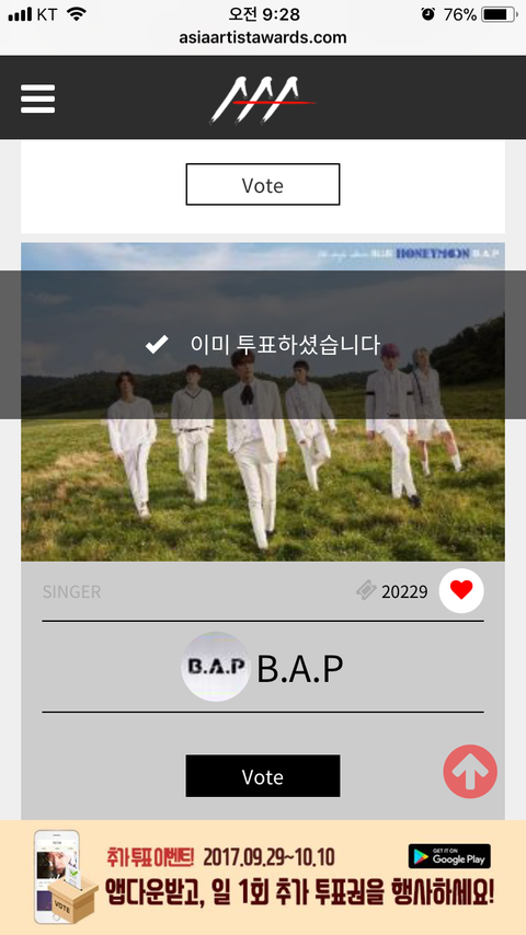 http://www.asiaartistawards.com/vote/lists 하루에 한번씩 아이디 얼굴책이랑 네ㅔ이버 둘 다 가능하니까 아이디있는사람 두개 다 하자! 10위안에 들때까지 파이팅ㅜ!!