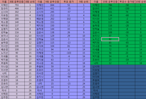 유지나랑 이해인의 투표수를 보면 됨