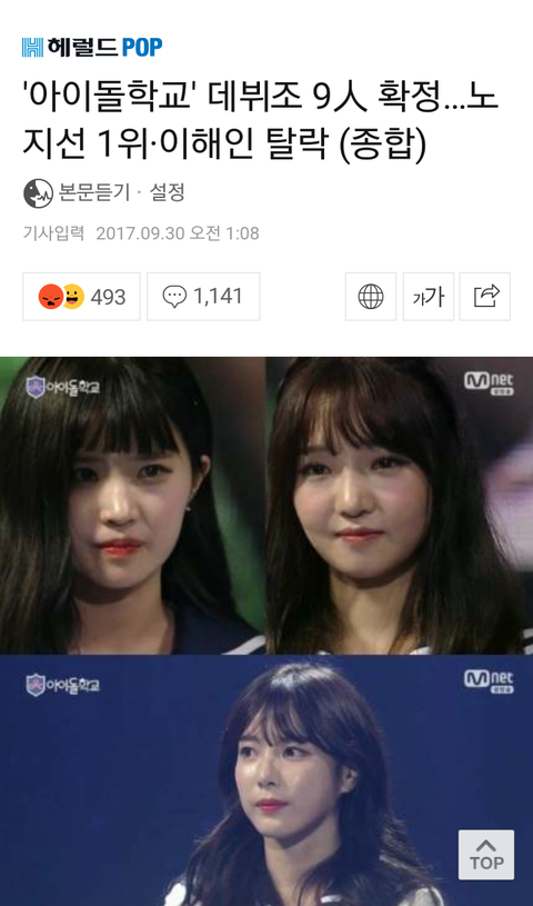 근데 유지나가 10위 이해인이 11위로 나왔으니