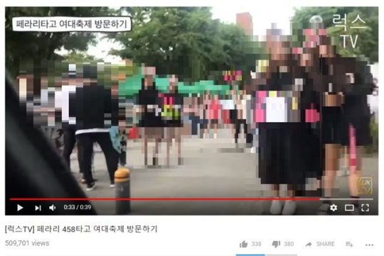 ‘페라리 458타고 여대축제 방문하기’라는 제목의 40초 가량의 영상은 슈퍼카를 탄 전 씨 일행이 학교 내부를 돌아다니며 찍은 것이다. 영상에는 전씨 일행이 캠퍼스 내 학생들을 보며 “쟤 번호 따야될 것 같아”라고 말하는 내용과 차량 근처를 지나가던 학생들의 얼굴이 모자이크 처리 없이 그대로 나왔다. 해당 영상은 50만 이상의 조회수를 기록하며 해당 채널의 최고 인기 동영상에 올랐다.