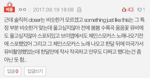 그리고 팬들 계속 somthing just like you (심지어 음원공개 2월이다) 랑 발매일이 말이 안된다 하는데 댓글도 남겼지만 15년 roses, 16년 closer (두곡 모두 체인스모커스 곡) 랑 세곡이 유사함. 들어보길. 차라리 걍 가만히 있어 팬들아 말도 안되는 예시들고와서 표절인정한게 아니라 우연치 않게 겹치는경우 공동으로 올린다 뭐 이딴 글 들고와서 뿌리지말고;;;; 곡들이 워낙 많으니 당연히 그런경우야 많겠지만 체인스모커스 팝에서 가장 핫한 아티스트야 ㅋㅋㅋㅋㅋㅋㅋㅋㅋㅋㅋㅋㅋ최소한 가수라면 모를수가 없다고;;