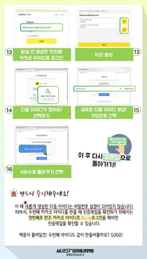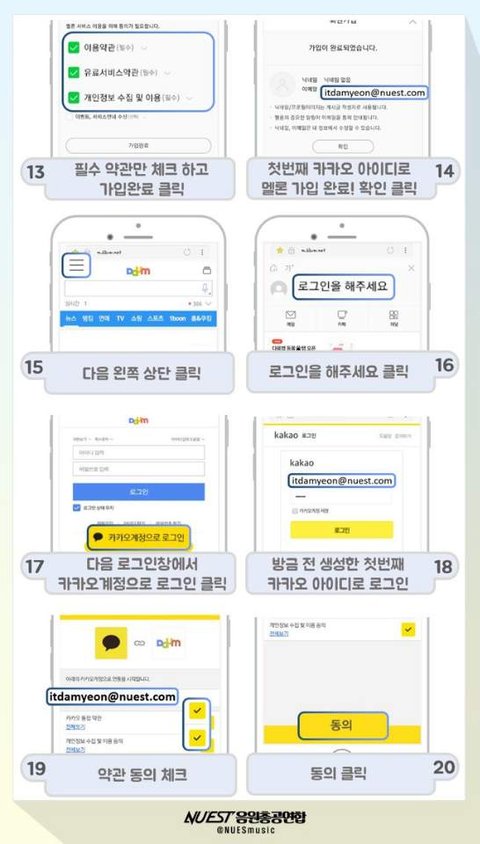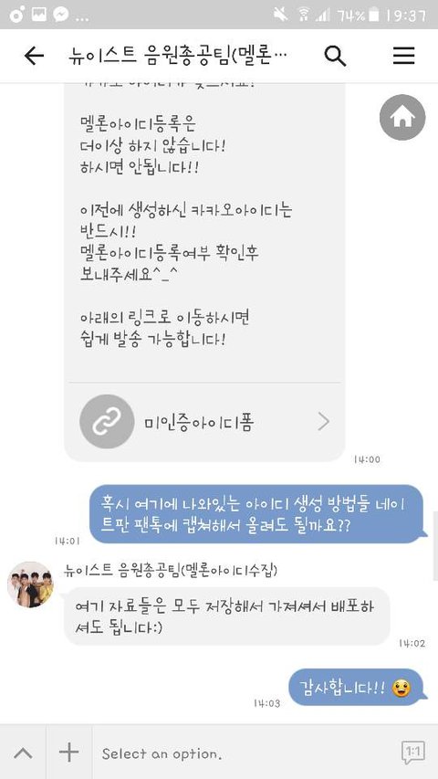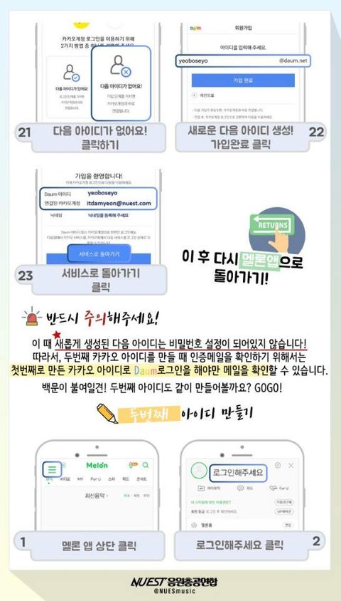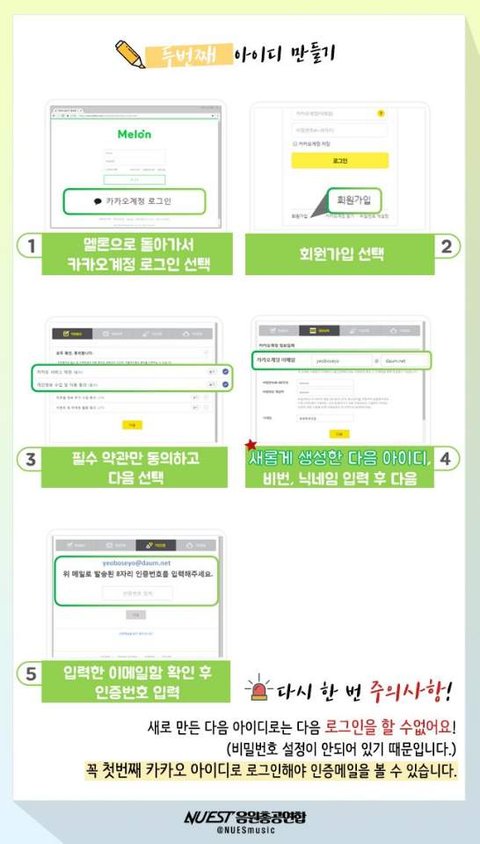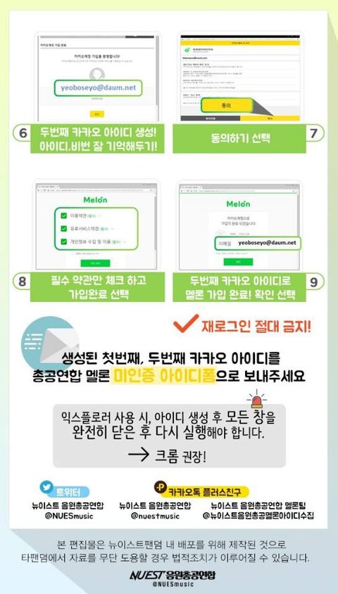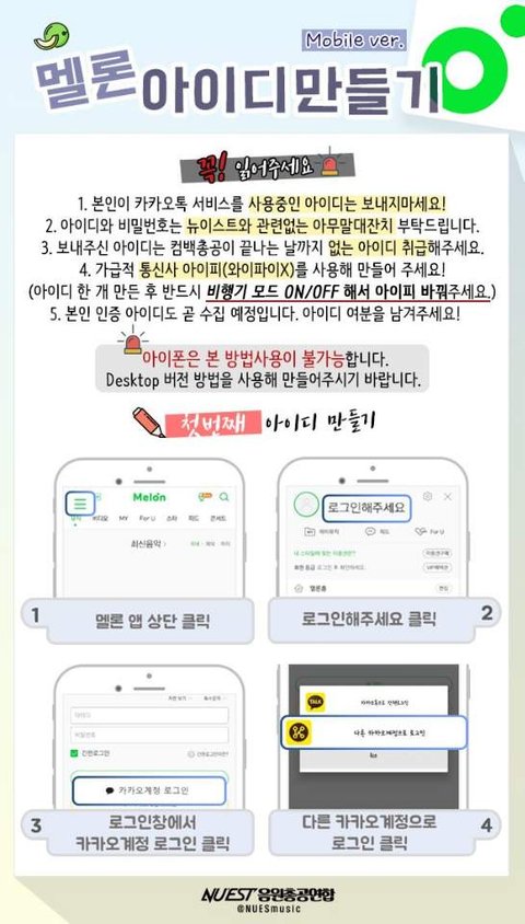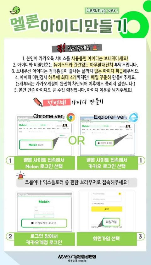 일단 나한테 질문 전에 카카오톡 플러스친구로 "뉴이스트 음원총공팀(멜론아이디수집)" 을 추가해서 한번이라도 거기 있는 정보 다 읽고 와줬으면 좋겠어!! 누구보다도 열심히 정리해놨거든!!!