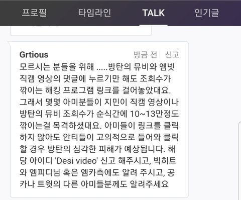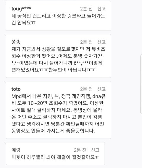 I-army.Alert!! Do not click strange site!! It has a hacking program to number down the music video!! 넵톡에 어떤분이 쓰신거야 널리 퍼뜨려줘!!!