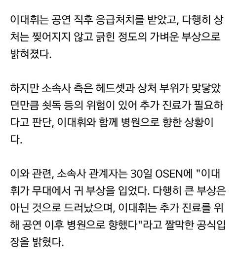 근데 공식 입장이 가벼운 부상?ㅋㅋㅋㅋㅋㅋㅋ 피가 심하게 났던데 가벼운 부상이라니....