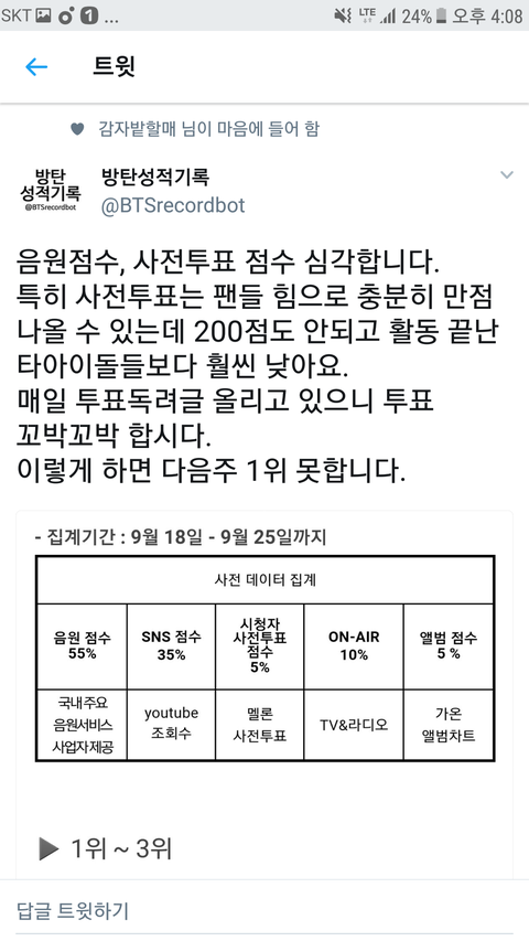 진짜 담주 1위 절대 못함. 미친듯이 투표 다하고 스밍해야 탄다. 다들 뭐하냐 진짜