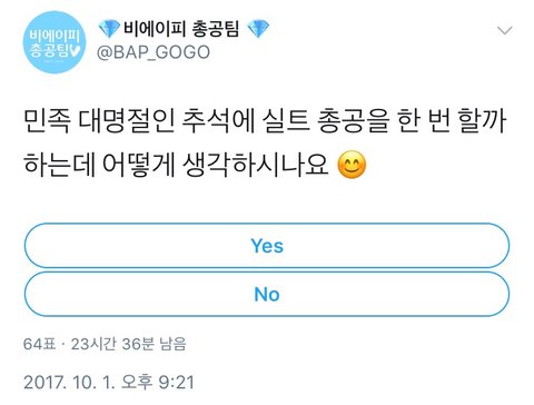 추석날 실트총공 어떤지 투표하는데 나는 조금 뜬금포이긴해도 우리팀, 노래 홍보하는데 도움될것같아서 하는것도 나쁘지 않다고생각하는데 다른베뷔들 생각은어때?