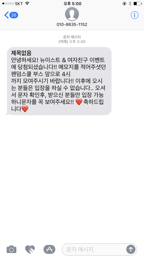 코뮤페 그 분홍옷입으신 이벤트 직원분이 오셔서 누구 팬이냐고 하셔서 당당하게 ㄴㅇㅅㅌ팬이라고 했더니 이벤트를 하고 있다고 하시더라고 저기 부스에 가면 포스트잇에 하고싶은말 적으면 뽑아서 막 어딜 가서 직접 만날수 있다는거야 그래서 내가 지금 한 몇천명 참여햇어요..?ㅠㅠ 이랬더니 아니라고 하시는거야 그래서 친구가 먼저 가서 쓰고 붙이고 나는 기다렷다가 가서 열심히 썼어 막 너무 많니 써서 전화번호 쓸 칸이 없더라 그래서 다시써도 되냐 여쭤보고 다시써서 그 붙이는데에 붙이고 왔어 당첨자한테는 문자가 세시반인가 언제까지 온다고 하시는데 내가 세시 50분쯤에 그생각이 나서 폰을 봤는데 문자가 안온거야 그래서 아 그럼그렇지 이랬는데 솔직히 그날 촉이 너무 좋아서 혹시 몰라서 아이폰이라 데이터를 켰더니 뭐가 온거야 .. 봤더니 와 대박 당첨됬다고 온거야 나진짜 놀래서 5초 멍때리다가 친구한테 말하고 부스 앞으로 뛰어갔어 거기 러브분들이 계셔서 막 서로 와ㅠㅠㅠㅠ 이러고 있었는데 그그 누구시지 노란옷 입으신분을 씨큐라고 부르나?? 그분들이 오시는거야 막 근데 어디랑 무전을 하는거같은데 막 갈까요? 이러는거야 그래서 막 또 다 설레서 헐 어디 가나 봐요 이러고 있는데 우리가 줄을 1~10 11~20 이런식으로 서있었단 말야 러브분들하고 그 다른 한 팬덤분들도 있었어 !! 그렇게 두그룹만 하는거 같더라고 그래서 막 갑자기 이동한다는거야 와 나 진짜 이때 손떨리고 입술 떨리고.. 차례대로 줄지어서 따라가는데 그 뭐지 이층인가 잘기억도 안난당 삼층인가 이층인가 중간에 들어가는 데 있잖아 푸드코트 사실그런데가 있는지도 몰랐는데 있더라고 그래서 거기 복도로 들어가서 안에서 계단을 하나 더 올라가는거야 그리고 왠 방으로 들어갔는데 진짜 방이 겁나 쪼끄매 상상할수 없이 쪼끄매 집에 있는방보다 쪼끄만거 같아 들어가서 기다리고 있었어 레드카펫 하고 오는 거라 엄청 돌아와야되서 오래걸린다고 하시더라고 엠씨분이..! 이제 그그 두그룹이라고 했잖아 그 여자아이돌분들 먼저 들어오셔서 같이 이벤트 하고 막 포스트잇 한분당 하나씩 뽑아서 앞에서 셀카찍어주시고 여성쇼핑몰옷들어잇는박스 선물로 주고 그랬어 그리고 드디어 와 와와...뉴이스트w 입장 햇어..... 들어오는데 그 흰색 슈트 알지 아송페랑 팬미팅이랑 레드카펫때 입은거 그거 입고 들어오는데 무슨 진짜 와.. 입이 떡 벌어지고 꿈인가 싶고 세상에 있는 카메라가 모두 죄가 있다고 느낄정도로 실물이 장난이 아니야 나 진짜 그렇게 가까이 본건 처음이였어 방이 진짜 쪼끄매서 세줄 앉고 한줄 조금 안되는인원은 서계셧는데 나는 조금 아쉽게도 셋째줄이였어 그래도 진짜 겁나 가까워 첫째줄분들은 정말정말 코앞이고 와 정말로 곽아론 정말 코높고 똑똑해보이는데 겁나 잘생겼고 웃을때 진짜 귀엽고 화면보다 백배로 잘생겼어 김쩨알 와 정말 말이 안나와 정말 잘생겼어 쌍커풀 완전 예쁘고 어깨도 넓고(이건팬미팅때도 느낀거지만 쩨아리 절대 외소하지 않아) 강배코 어깨 진짜 넓고 얼굴 겁나 쪼끄맣고 진짜 잘생기고 갸름하고 최망고 정말 잘생기고 예뻐 턱이 진짜 갸름하고 눈이 진짜진짜 예뻐 시간이 그렇게 길지는 않고 재보진 못했지만 뉴이스트w 만난건 15분정도 되고 기다리는시간 여자아이돌분들 뉴이스트w 다 끝나고 나가니까 한시간정도 지나있더라 나 너무 자랑하고 싶었어 사실 그리고 그그 혹시 이건 문제될까봐 그 여자아이돌분들 언급을 제대로 못했는데 정말정말 예쁘시고 비율 장난아니셔... 정말 연예인분들이 괜히 연예인이 아니야 아 그 뉴이스트w도 한명씩 포스트잇 뽑아서 당첨되신 분들 같이 셀카찍었는데 정말 부러웠어 너무 부러웠어 한분은 우시니까 민기가 달래주면서 어깨동무라해야되나 어깨 이렇게 감싸고?? 사진찍어줫어 대박이야 아아 그리고 처음에 사진찍는데 종현이가 폰을 받았는데 나 사진 잘 못찍는데~ 이래서 곽아롱이 폰들고 사진찍었어 근데 사진찍고 쩨아리가 아 거기 누르면 찍히는구나 이래서 뭔가 했는데 그 폰 옆에 버튼 누르면 사진 찍히잖아 그걸 몰랐데... 진짜 귀여워 죽을뻔했어 내가 정말 크게 느낀건 아롱이 화면보다 실물이 훨낫고 물론 배코 쩨알 민기도 아아 그리고 김쩨알이 뽑은 포스트잇이 오빠 맨날 잘생긴 얼굴 보면 무슨 생각들어요 이거였는데 쩨알이가 똑같아요~ 거울보면서 아 오늘은 피부가 많이 건조하네 이런 생각한다고 했어 ㅠㅠㅠㅠㅠ 귀여워 죽겄어