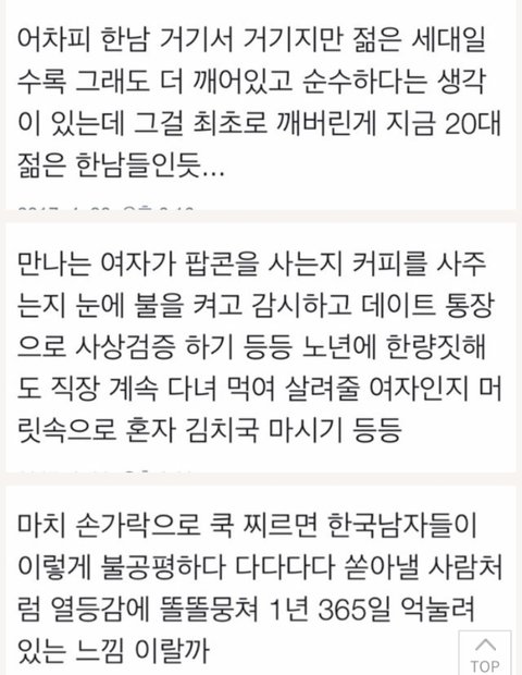 ㅋㅋㅋ남자들이 깨어나는거지. 더이상 책임감갖고 여자 먹여살리기도 싫고. 요즘엔 각자 알아서 살수있는 능력있는 사람끼리 만난다. 여자도 돈낼줄알고 무조건 매달리지 않고 독립적이여야함 요즘엔. 남자들이 이제 호구되지않으려하니 한남이니 뭐니까내리는거봐 ㅋㅋ