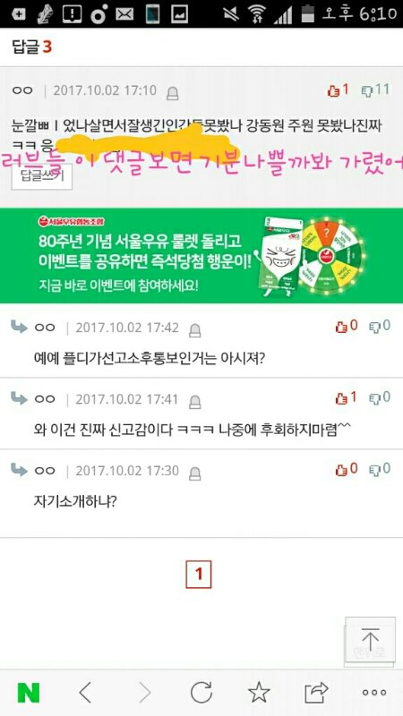 러브들 ㅇㅌ에 아롱이글있지?? 그 글 순찰돌고있는데 기분나쁜댓글봤어ㅠㅠ 피디엪딸려고하는데 내폰으로는 안된다네..ㅠㅠ이 글보면 바로 피디엪 따주라ㅠㅜ ㅇㄱㄹ생퀴들 할많하않....✊✊✊✊