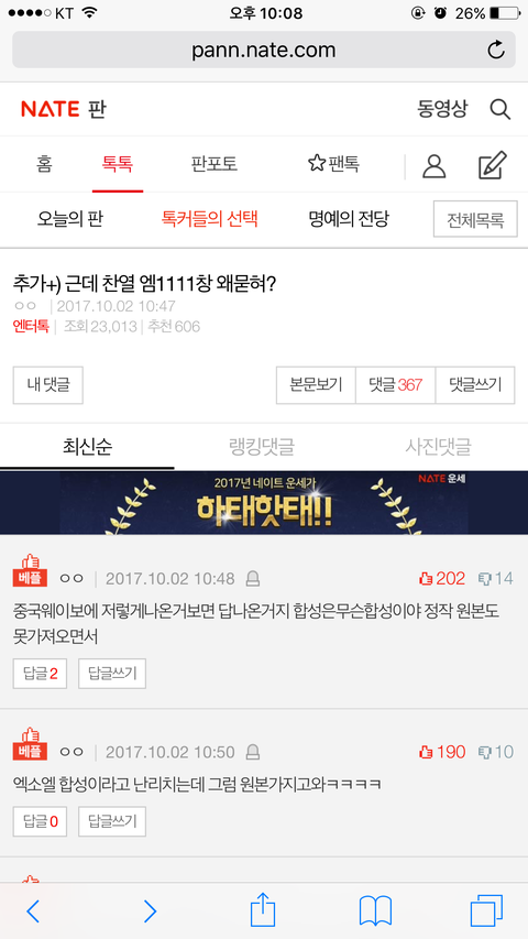 반대로는 안끝날거같은데 __ 이거 세번째 베댓 반대수 많긴한데 아오 __ 여기년들이 추천 누른거 아니지 __ 누가 하이퍼 만들어올수있냐 톡선 바로 앞에 있음