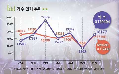 엑소에 대한 키워드 검색은 그래프에 표시하지 않은 19일부터 21일까지 사흘간만 해도 각각 2만2,599건 5만5,508건 2만8,403건이고 28일까지 나머지 기간의 버즈량을 합산해도 독보적인 1위다. 사흘 동안 버즈량이 껑충 상승한 20일은 ‘제1회 소리바다 베스트 케이뮤직 어워즈’가 개최된 날로 대상을 차지했다. 이로써 엑소는 5년 연속 가요시상식 대상을 수상한 것으로 기록됐다. 팬들은 엑소를 향한 사랑을 증명하듯 버즈량이 집계되는 온라인 플랫폼에서 엑소 키워드를 검색했다. 사흘 간의 기록을 발판으로 삼아 22일부터 28일까지의 나머지 버즈량 조사도 엑소가 휩쓸었다. 그래서 추석 명절을 앞두고 함박웃음을 짓는 한류스타인 셈이다.