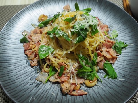 베이컨과 생바질 . 명란과 마늘로 오일파스타 간단하게 해서 먹었습니다. 베이컨을 넣으실땐 간을 연하게 하셔도 됩니다.