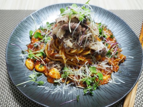 요건 업진살 토마토 파스타입니다. 곁들임 재료가 있으면 좀 맵게해야 맛있는 거 같습니다. 맵게해서 입진살이랑 같이 싸서먹었습니다.
