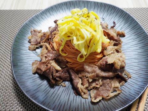 요건 업진살 털이용 비빔국수입니다. 계란 삶기 귀찮아서 지단을 올렸는데 넘 맛있어요.