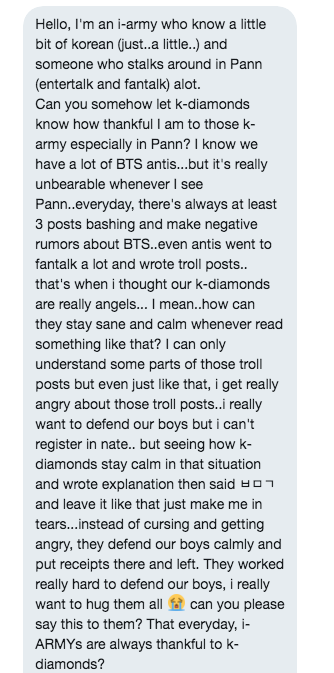 안녕, 난 한국말 쪼금 (아주 조금..) 할줄 아는 해외아미야글구 판 글들훔쳐보곤 함 (엔터글들이랑 팬톡)혹시 너가 케이다이아들에게 내가 얼마나 걔네들한테 고마운지 전달해줄수 잇겟어? 특히 판에 잇는 애들한테