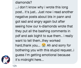 걔네들은 정말 우리 애들 막아준다고 그렇게 열심히 하는거 보고 진짜 안아주고 싶엇어 ㅠㅠ제발 이거 전달해 줄수 잇어? 해외 아미들은 케이다이아들에게 진짜 항상 고마워 한다는거?