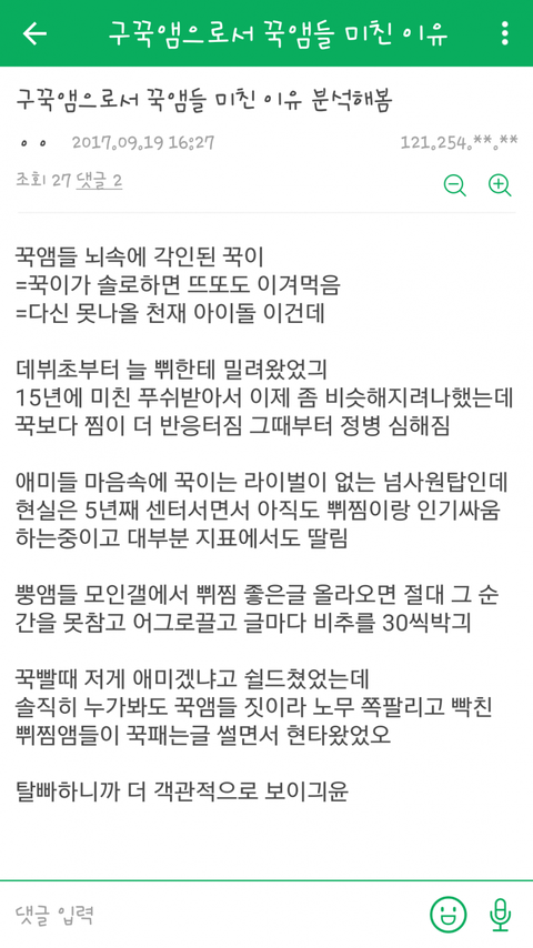 방탄팬들 모인곳에서 뷔지민 좋은글 올라오면 절대 그 순간을 못참고 어그로끌고 글마다 비추를 30씩 박음