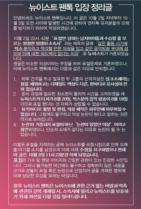 얘네 입장문 등 뭐 올라올적마다 느끼는거지만 러브 얘네는 조카 무서워. 조카 오늘일만해도 겁나 열받을텐데 감정 1도 안섞고 딱 할말만하자나. 얘네 절대 착한거 아냐 개념이 제대로 박힌거지. 워낙 무개념들이 많은 곳에 있다보니 더 튀어보이는거야. 얘네랑 붙으면 골로갈거같다. 암튼 러브 니네 힘내고 !! 항상 느끼는거지만 너네 입장문이던 뭐던 나중에 강연좀...