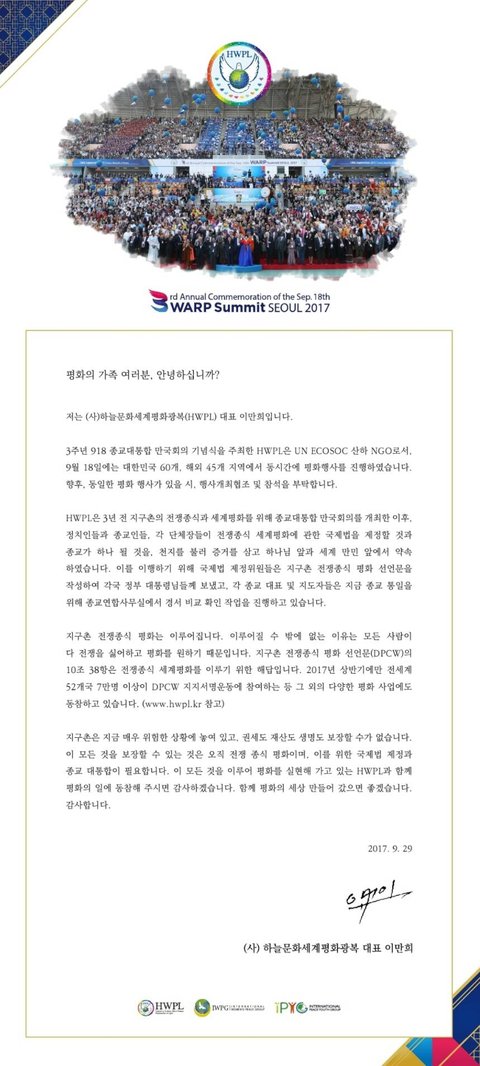 얼마 전 9월 18일에 있었던 종교대통합 만국회의(WARP)의 주최기관인 민간 평화단체 hwpl의 감사편지였답니다.