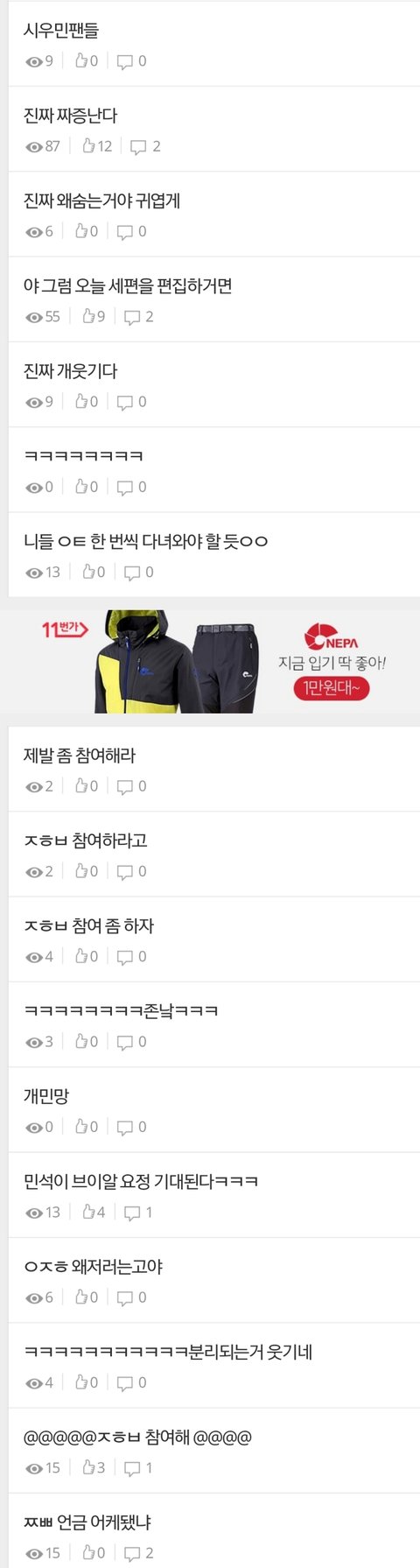 조회수 별로고 소수가 달리는데도 정화방참여하라고 도배하면서 '진짜짜증난다'저글로인해 분위기 망치고 개판됨