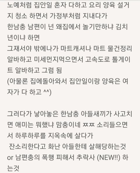 한국남자랑결혼해서애낳고 회사짤리고 뱃가죽쳐지고 집에갇혀서