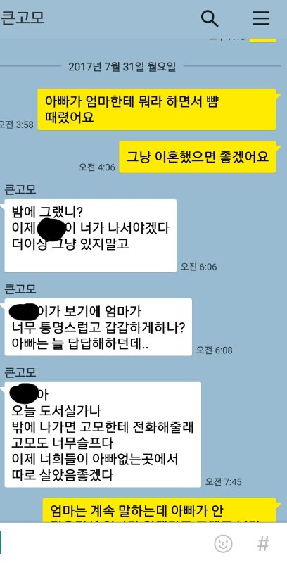 +) 고모한테 이혼했으면 좋겠다고 톡 보낸 것도 엄청 고민하다가 보냈고 고모랑 했던 톡 내용 엄마한테도 다 보여줬어