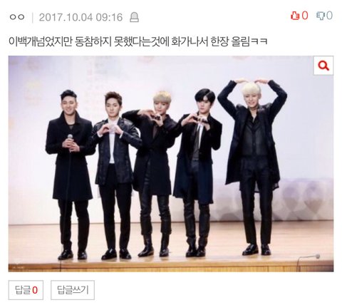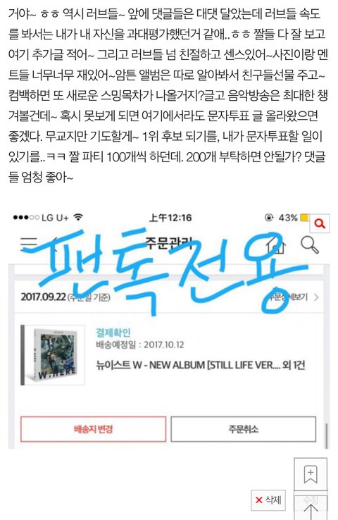 아. 외국 사이트을 보면 아주 가끔씩(진짜 쪼~끔) 러브들의 전달사항에 오타가 있던데 혹시 영업글이나 전달사항을 외국으로 날릴거 있으면 댓글로 남겨줘 내가 보면 번역해줄게.(러브들 너무 잘하지만 추석에라도 조금 도움이 될까 해서) 난 영어랑 중국어 할 수 있는데 러브들이 리더 닮아서 영어는 잘 할거고 ㅎㅎㅎ 혹시 필요한 글은 중국어로 번역할게.