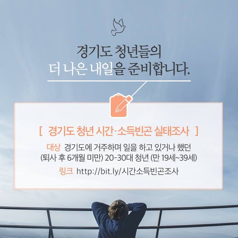 <경기도 청년 시간·소득빈곤 실태조사>▪️ 조사기간 : 9월 8일 ~ 10월 5일▪️ 조사대상 : 경기도에 거주하며 일을 하고 있거나 했던(퇴사 후 6개월 이내) 20-30대 청년(만 19세 ~ 39세)▪️ 참여하기 : http://_/시간소득빈곤조사▪️ 청년유니온과 함께하기 : http://_/청유가입