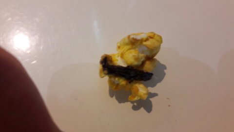 영화가 끝난 후 밝은 데로 나와 팝콘을 살펴보니 아래 이미지에서 보는 것처럼 남은 팝콘에 검은색 이물질이 섞여 있는 것을 발견했습니다. 식재료가 아닌 것이 분명했고, 마치 비닐 같이 보이기도 하여 매표소에 가서 책임자에게 항의했습니다.