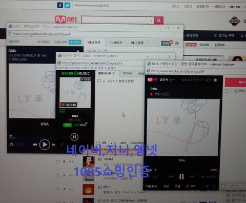 지금 멜론 2개 돌리고 풀스밍하고 있고 네이버뮤직, 지니뮤직, 엠넷은 한시간마다 dna만 한번씩 돌리고 있어