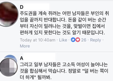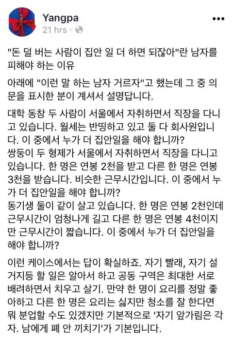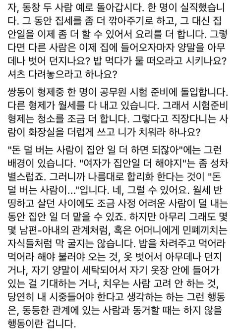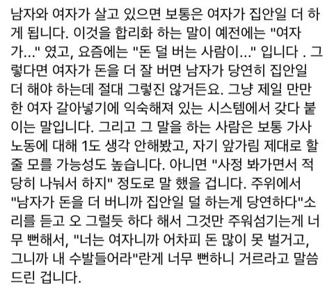 저렇게 예시 들어가며 설명해줘도 딴지거는 한남들 머리나쁘지?? 도태한남 머릿속에는 돈많은 남자 꼬셔서 남자돈으로 편히사는 여자들만 있나봄ㅋㅋㅋ 맞벌인데도 여자가 더 집안일 많이한다는 팩트를 제시해도 웅엥웅 남자가 천만원벌어와도~~ 뒤져그냥~ 어떻게 단 한놈도 난 집안일 잘할건데 이러는 놈이 없냐 ㅋㅋㅋ 역시 한국남자 클라스 대단ㅋㅋㅋㅋ