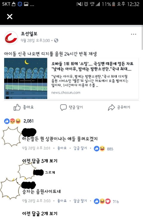 페이스북 조선일보 페이지에 아이돌극성팬들때문에