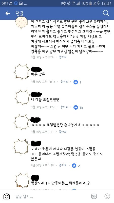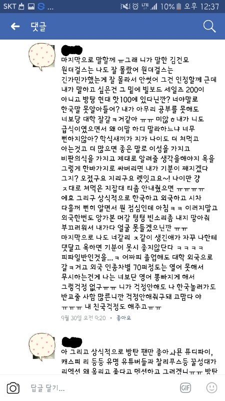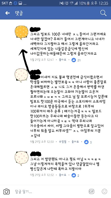 근데 한 방탄소년단 여자팬이 여기에 댓글을달앗는데 거기에 대댓으로 일반인들이랑 개싸움.....걍봐보셈