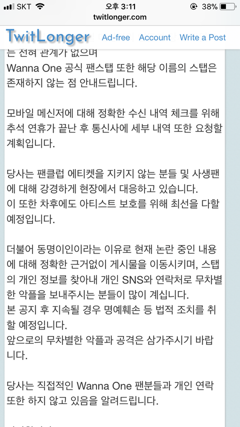 삭제후는통신사내용이빠졋더라고요 그리고 읽어보시면 그런이름의 매니저분은 없다고햇지만 계속읽어보시면 동명이인이란이유로 악플달지말아달라는 내용이있습니다 처음엔 그런이름 없다면서요 팬들을호구로아십니까?