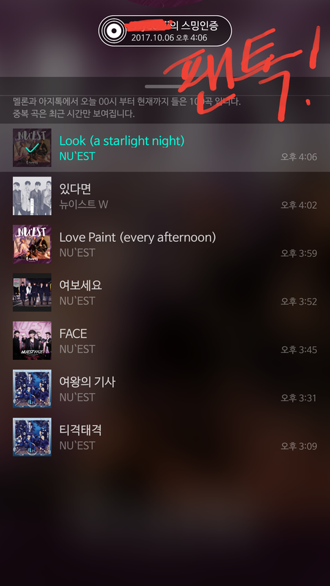 내가 뉴이스트 노래 틀어달라구 했더니 여보세요랑 있다면이랑 럽페랑 나같차 룩 다 나오고 있는데 넘 뿌듯해ㅋㅋㅋㅋㅋ♡♡