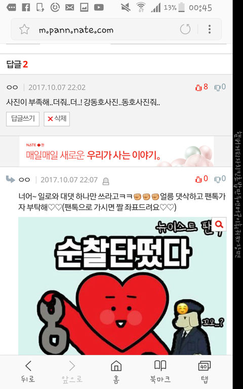 이 댓글 쓴 사람입니다..프듀안봐서 사실 친구들한테들어서 강동호 이름만알지 잘 몰랐습니다...그런데..뉴이스트팬분들이 올린거 영업글??이라던데 그거봤는데 세상 잘생기고 섹시하더라고..사진주실수있나요 그리고 여기에 글써도되나요?..팬톡 여기맞나여..?