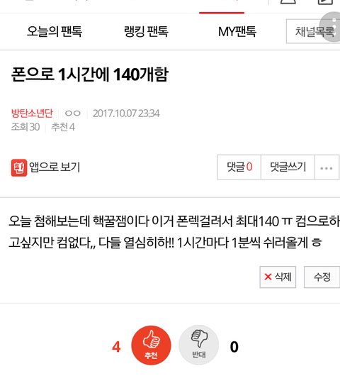 어떤이삐가 하루에 40개했다고 근데 너무힘들대서 내가 이런 이삐들 많을까봐 툽 잘안오르는 이삐들 팁알려준다고 방판건데 다른이삐가 관음많으니까 빛삭하래서 삭제했거든?