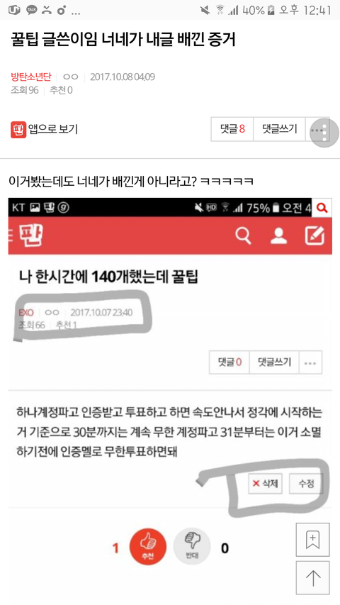 시간 캡하고 아이디 두개로 번갈아가면서 도둑년프레임 오졌고 ㅋㅋㅋㅋ 근데 시간도 내글이 먼저임 ㅅㄱ 아니 베낀년이 주인오면 어쩔라고 저난리쳐놈? ㅋㅋㅋㅋㅋㅋㅋ;;;;