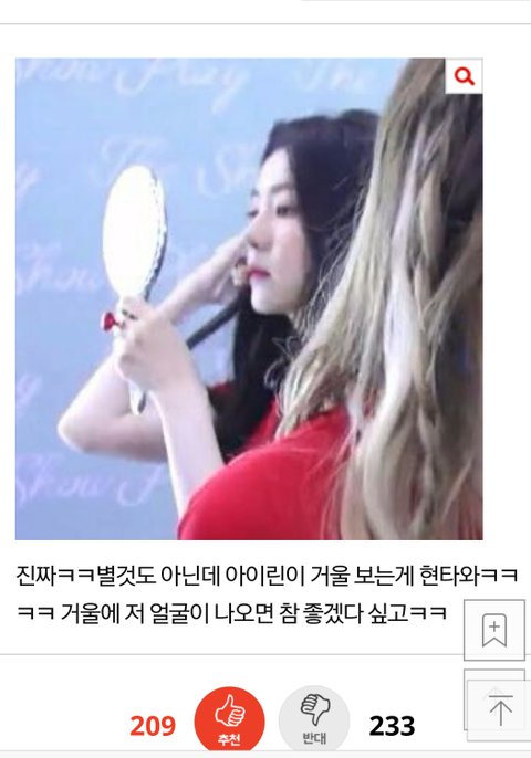 아이린 칭찬글만 가면 반대랑 추천수가 맞먹는다. 오히려 반대가 많을 때도 봤다.