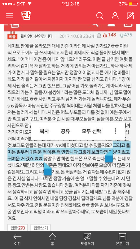 일단 잘잘못을 떠나서 페메나 디엠으로 충분히 말할수 있었던것 같음. 굳이 판에 이렇게 올릴필요 없단소리. 그리고 댓글보면 내가 권율이였으면 커서보고 수치심들거라고들 하는데 난 진짜로 진지하게 우리엄마가 나 애기때 알몸사진 올렸었으면 수치스럽긴하겠지만 그걸로 우리엄마가 욕먹는게 더 기분나쁘고 속상할것같음