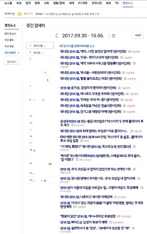 9월30일부터 10월6일 우리 강단이 지난주 주간검색어 1위 대단해 강단이 18주째 주간검색어 입성 ㅊㅋㅊㅋ♥ 우리원 우리강단이 다 멋지다 ㅎㅎ