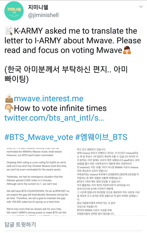그래서 이 밑 멘션에 이 투표가 중요하지 않다면 한국아미들이 이 편지를 안보냈을거야 열심히 하자 ㅇㅇ 이런거 있고 또 미안해 할게 뭐있어~ 다 같이 열심히하자! 이런 댓글도 있고ㅠㅠㅠ 힘내자 화이팅!!!!