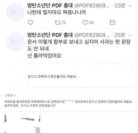그 글 이미 본사람이 많은데 이미지 깎인건 어쩔건지. 사람들은 까는 글은 기억하고 해명글은 보지도않는데. 알지도못하면서 주작한걸로 선동해서 아직까지도 우리애들이 머리채를 얼마나 잡히는데. pdf파일로 남겨져서 이미 넘겨졌다면 그건 당신이 남의 상처 생각안하고 섣불리 저지른일에 대한 댓가일거에요. 다시는 우리 애들 건들지말길 바라요.